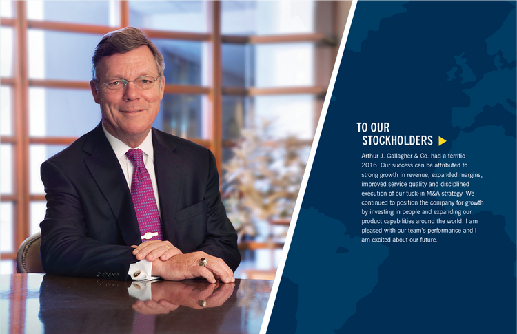 I was the lead designer for the 2016, 2017 and 2018 reports. As lead, I handled client communications and reviews, design concepts, and final production and preparation of artwork for print. Additionally, I helped direct the photo shoots for the portrait of J. Patrick Gallagher Jr. - Chairman, President, and CEO.